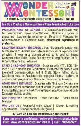 Wonder Montessori invites applications for Principal, Lead Montessori Educator, Early Childhood Educator and Admissions Incharge posts. Montessori certified candidates preferred. Salary no bar for deserving candidates.