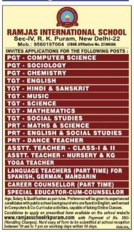 Ramjas International School, R.K. Puram, is a reputed CBSE-affiliated institution known for academic excellence and holistic development. The school invites applications from trained, qualified, and experienced candidates for the following posts.