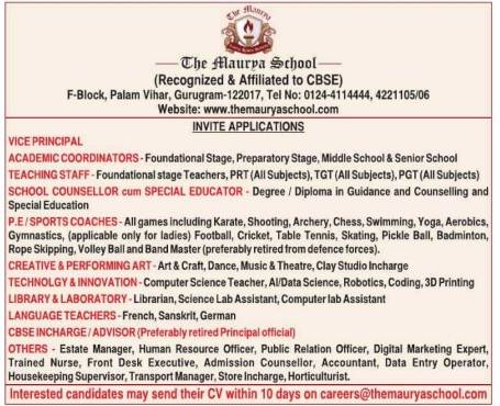 The Maurya School Palam Vihar Gurugram invites applications for Vice Principal, Academic Coordinators, PGT, TGT, PRT, Counsellor, Sports Coaches, Computer Science, AI, Robotics, Librarian and multiple administrative posts. Apply within 10 days.