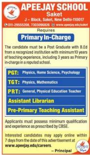Apeejay School Saket New Delhi invites applications for Primary In-Charge, PGT Physics, Home Science, Psychology, TGT, PRT, Assistant Librarian and Pre-Primary Teaching Assistant posts. Apply online within 7 days.