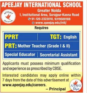 Apeejay International School Greater Noida invites applications for PPRT, PRT Mother Teacher, TGT English, Special Educator and Secretarial Assistant posts. Apply online within 7 days.