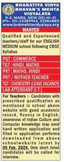 📢 We Are Hiring – Teachers & Lab Attendant Bharatiya Vidya Bhavan’s Mehta Vidyalaya, K.G. Marg, New Delhi