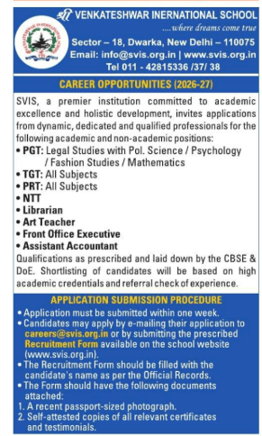 Shri Venkateshwar International School Dwarka invites applications for PGT, TGT, PRT, NTT, Librarian, Art Teacher, and non-teaching posts for the 2026–27 session. Apply online or via email. CBSE school jobs in Delhi.