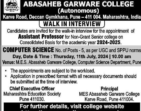 Abasaheb Garware College, Pune Walk-in Interview on 11th July 2024 at 10am.