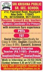 Sri Krishna Public Sr. Sec. School Najafgarh invites applications for Academic Coordinator, PRT, TGT, and PET (Female) posts. Walk-in interview on 20 February 2026.