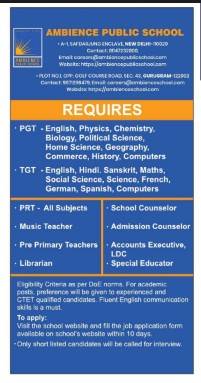 Ambience Public School, New Delhi invites applications for PGT, TGT, PRT, and non-teaching staff positions. Apply online within 10 days as per CBSE norms.