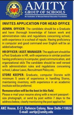 Amity Group of Schools, New Delhi invites applications for Admin Officer, HR Officer/Assistant Manager, and Store Keeper positions at the Head Office. Graduates and experienced candidates preferred. Apply via email within 7 days.
