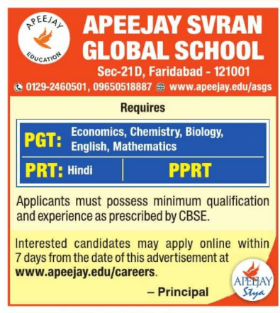 Apeejay Svran Global School Faridabad invites applications for PGT, PRT, and PPRT teaching positions. CBSE-qualified candidates can apply online within 7 days. Teaching jobs in Faridabad.