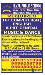 B.V.M Public School Najafgarh hiring TGT Computer (AI), English, PRT, Music & Dance teachers. Walk-in interview on 12 Oct 2026.