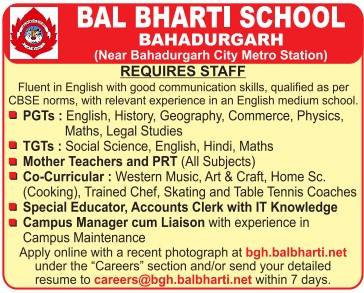 Bal Bharti School, Bahadurgarh, invites applications for teaching and non-teaching positions including PGT, TGT, PRT, Mother Teachers, Special Educator, and Co-Curricular staff. Apply online or email your resume to careers@bgh.balbharti.net