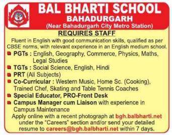 Bal Bharti School Bahadurgarh invites applications for PGT, TGT, PRT, Special Educator, Campus Manager, and Co-Curricular positions. Apply online or via email within 7 days. CBSE-qualified candidates preferred.