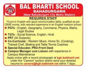 Bal Bharti School Bahadurgarh Recruitment 2026 for PGT, TGT, PRT, Special Educator, Coaches and non-teaching staff. Apply via email within 7 days.