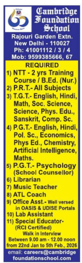 Cambridge Foundation School Delhi invites applications for NTT, PRT, TGT, PGT, Librarian, Special Educator, and staff positions. Walk-in interviews from 22 Jan to 15 Feb 2026. CBSE school jobs in Delhi.
