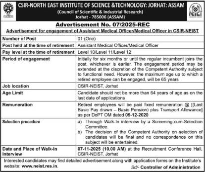 CSIR-NEIST Jorhat invites retired medical professionals for engagement as Assistant Medical Officer / Medical Officer on a contractual basis. Walk-in interview on 7th November 2025. Apply as per DoPT and CSIR norms.