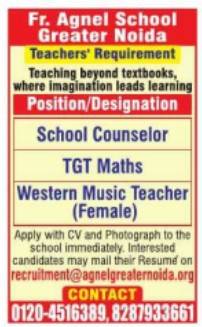 Fr. Agnel School Recruitment 2026 in Greater Noida for School Counselor, TGT Maths and Western Music Teacher (Female). Apply via email or submit CV directly.