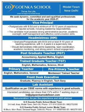 G D Goenka School, Model Town, New Delhi, invites dynamic, committed, and well-qualified professionals to join their esteemed institution for the academic year 2026–27. The school seeks experienced leaders and passionate educators dedicated to excellence in teaching and learning.