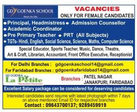 GD Goenka School hiring Principal, Headmistress, PRT, TGT, and staff in Janakpuri Delhi & Faridabad. Female candidates only. Apply within 7 days.