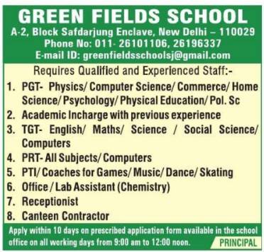 Green Fields School, Safdarjung Enclave, New Delhi invites applications for PGT, TGT, PRT, Academic In-Charge, PTI/Coaches, and administrative staff. Apply within 10 days.