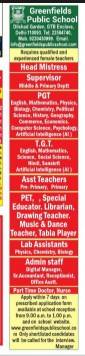 Greenfield Public School Dilshad Garden Delhi invites applications for Head Mistress, PGT, TGT, PRT, Special Educator, Librarian and Admin Staff positions. Apply within 7 days.