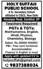 Holy Suffah Public School Recruitment 2026 for PGT and TGT teachers in Mathematics, English, Hindi, Physics, Chemistry and Biology in Sambhal, Uttar Pradesh.