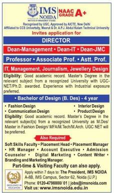 IMS Noida invites applications for various academic and administrative positions for its management and design programs.