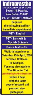Indraprastha International School Dwarka hiring PGT English, TGT Sanskrit & Social Science, and Dance Instructor. Walk-in interview on 25 April 2026.