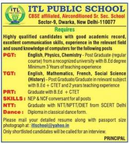 ITL Public School Dwarka invites applications for PGT English, Physics, Chemistry, TGT English, Maths, French, Social Science, PRT, NTT, and Dance Teacher posts. Apply via email with resume and photo.