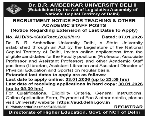 Dr. B.R. Ambedkar University Delhi invites applications for Professor, Associate Professor, Assistant Professor, Librarian, and Sports Director posts on a regular basis. Apply online by 23 January 2026.