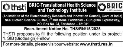 Apply for the SIB (Biodesign) Fellow position at THSTI, Faridabad. Check eligibility and application details on www.thsti.res.in.
