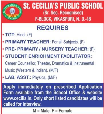 St. Cecilia’s Public School is hiring Primary, Pre-Primary Teachers, Enrichment Facilitators & a Physics Lab Assistant. Apply now on our website.