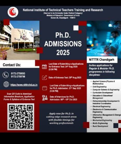 NITTTR Chandigarh invites applications for Ph.D. programmes (Regular & Modular) in Engineering, Management, Education, and Applied Sciences. Apply by 26 Aug 2025 for entrance test. Flexible options for professionals.