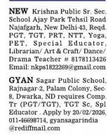 New Krishna Public Sr. Sec. School, Najafgarh and Gyan Sagar Public School, Palam Colony, New Delhi invite applications for PGT, TGT, PRT, NTT, Special Educator, Librarian, Yoga, Art & Craft, and other teaching posts.