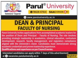 Parul University Vadodara invites applications for Dean & Principal – Faculty of Nursing. Apply within 7 days. Leadership opportunity in NAAC A++ accredited university in Gujarat.