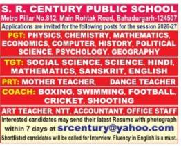 S.R. Century Public School Meerut invites applications for PGT, TGT, PRT, Dance Teacher, Sports Coach, Art Teacher, NTT, Accountant, and Office Staff for the 2026–27 academic session. Apply within 7 days.