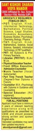 Sant Kishori Sharan Vidya Mandir, Sector 158, Noida invites applications from qualified and experienced candidates for the academic session 2026.