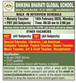 Shiksha Bharti Global School, Sector-8 Dwarka New Delhi invites applications and walk-in interviews for Nursery Teacher, PRT, PGT, Special Educator, Librarian, Computer, French, Dance, Music, Art & Craft Teacher and Receptionist posts 2026.