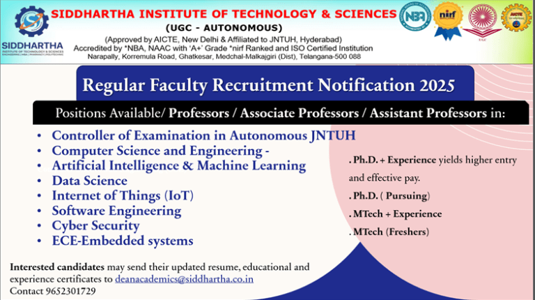 Faculty Recruitment 2025 at Siddhartha Institute of Technology & Sciences, Hyderabad. Teaching positions in Engineering, Management, and Sciences. Apply via email for immediate openings.