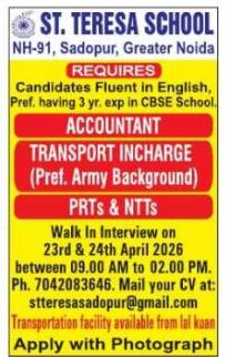 St. Teresa School Greater Noida hiring Accountant, Transport Incharge, and PRT/TGT teachers. Walk-in interview on 23rd & 24th April 2026.