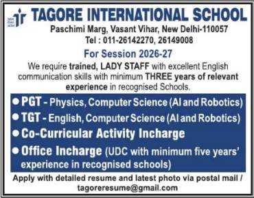 Tagore International School, Vasant Vihar, New Delhi invites applications for PGT, TGT, Co-curricular Activity In-Charge, and Office In-Charge posts for the 2026–27 session.