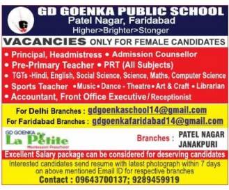 GD Goenka Public School Faridabad invites applications from female candidates for Principal, Headmistress, PRT, TGT, Pre-Primary Teachers, Librarian, Accountant, and administrative posts for Delhi and Faridabad branches.
