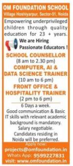 Apply for teaching and staff jobs at OM Foundation School, Noida. Openings for Counsellor, Computer/AI Teacher, and Front Office Trainer. Apply now.