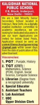 Kalghidhar National Public School Inderpuri invites applications for PGT, TGT, Librarian, Special Educator, Lab Assistant, and UDC posts. Apply within 7 days via email.