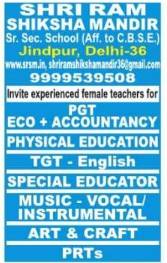 Shri Ram Vikash Mandir Sr. Sec. School Indrapuri Delhi invites applications for PGT Economics & Accountancy, TGT English, Physical Education, Special Educator, Music, Art & Craft and PRT posts.
