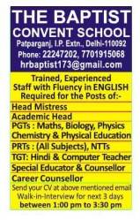 The Baptist Convent School Delhi invites applications for Head Mistress, PGT, TGT, PRT, Special Educator and Counselor posts. Trained candidates with English fluency can apply via email.