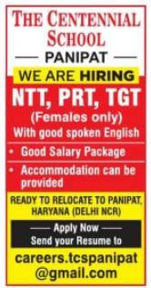 The Centennial School Panipat Recruitment 2026 for NTT, PRT and TGT female teachers. Good salary and accommodation provided. Apply via email.