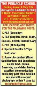 The Pinnacle School, Panchsheel Enclave, New Delhi invites applications for PGT Sociology, TGT (English, Hindi, Maths, Social Science, French, Sanskrit, Art), PRT, Special Educator, Yoga Instructor and Junior Accountant posts.