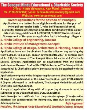 The Sonepat Hindu Educational & Charitable Society invites applications for Principal positions on a regular basis for Engineering, Management, and Architecture colleges in Sonepat. Apply by 27 January 2026.