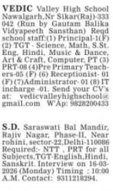 Vedic Valley High School, Rohini invites applications from qualified and experienced candidates for teaching and non-teaching posts for the academic session 2026.