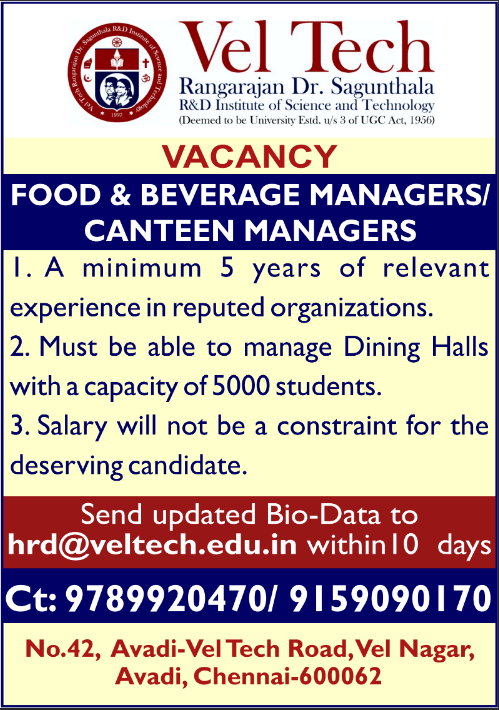 Vel Tech Rangarajan Dr. Sakunthala R&D Institute of Science and Technology, Chennai invites applications for Food & Beverage Managers / Canteen Managers with 5+ years experience. Apply via email at hrd@veltech.edu.in