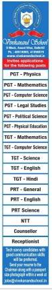 Venkateshwar School, Dwarka, New Delhi invites applications for PGT, TGT, PRT, NTT, Counsellor and Receptionist posts. Apply via email with resume and photograph.